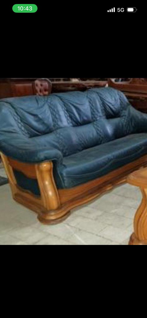 1x 3 seat leather couch in wooden frame