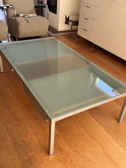 Gerenoveerde salontafel met glazen blad + lade