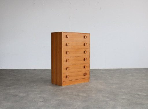 Teak Deens ladekast met 6 lades en houten grepenTeak Deens ladekast met 6 lades en houten grepen