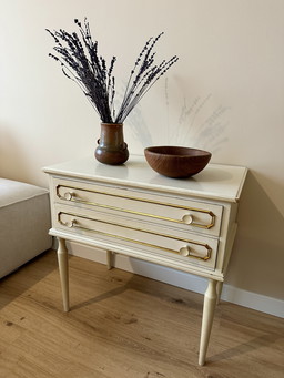 Gerestaureerd Art Deco nachtkastje – handgemaakte eikenhouten meubelen en krijtverf met gouden details
