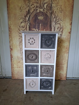Kleine ladekast walnoot + shabby wit, Engelse antieke stijl