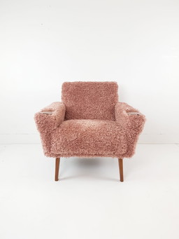 Mid - Eeuw Fauteuil Pioen Kleur Boucle Scandinavisch Design Houten Lounge Stoel