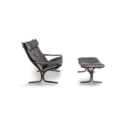 HS design Teakhouten fauteuil in mid-century stijl met lederen bekleding en bijpassende voetenbank.