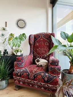Gerestaureerde fauteuil in koloniale stijl met wandtapijt met paardenmotief