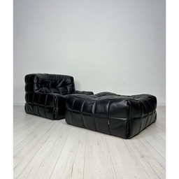 Vintage lederen 'Kashima' 1-zits + voetenbank door Michel Ducaroy voor Ligne Roset jaren 80Vintage lederen 'Kashima' 1-zits + voetenbank door Michel Ducaroy voor Ligne Roset jaren 80
