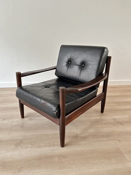 Vintage Deense Teak Fauteuil Met Zwart Leer