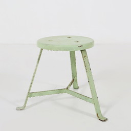 Industrieel groen geschilderd krukje met stalen onderstel en houten blad, 1930S