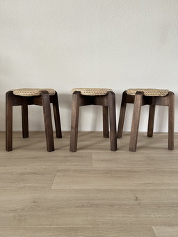 Houten krukje uit Mid Century met rotan zittingHouten krukje uit Mid Century met rotan zitting