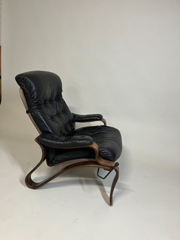Loungefauteuil uit de jaren 80 — Wiener Weave & leer — Verstelbare rugleuning — Vintage Scandinavische stijl
