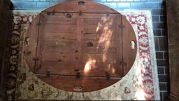 Antieke handgesneden mortier salontafel met rond glazen blad