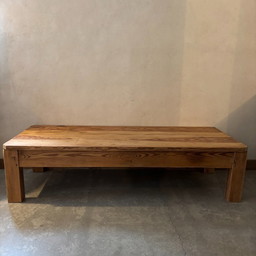 Grote brutalistische houten salontafelGrote brutalistische houten salontafel