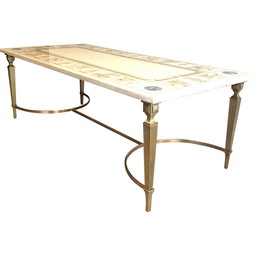 Vintage bronzen en messing salontafel met marmeren blad versierd met Griekse motievenVintage bronzen en messing salontafel met marmeren blad versierd met Griekse motieven