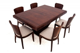 zoom_in Originele notenhouten uittrekbare tafel, ontworpen door Louis Majorelle, met 6 Art Deco stoelen. zoom_in Originele notenhouten uittrekbare tafel, ontworpen door Louis Majorelle, met 6 Art Deco stoelen.