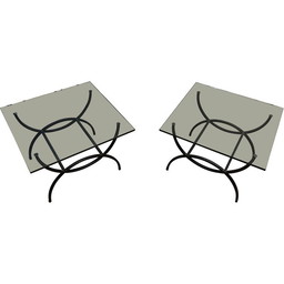 Paar vintage bijzettafeltjes van zwart gelakt metaal en glas, Frankrijk 1950