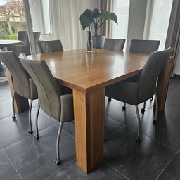 vierkante eettafel van 150x150 cm met 6 comfortabele leren eettafelstoelen