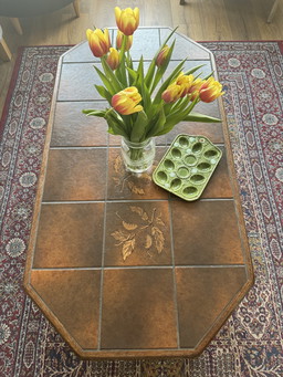 Octogonale salontafel in Mid Century-stijl met betegeld houten blad