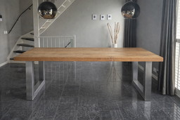 Massief eikenhouten eettafel (230 x 120 cm) – industrieel met RVS potenMassief eikenhouten eettafel (230 x 120 cm) – industrieel met RVS poten