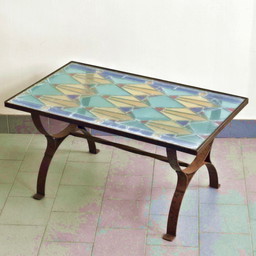 Vintage brutalistische salontafel uit de jaren 60 van metaal, glas en gebrandschilderd glas.