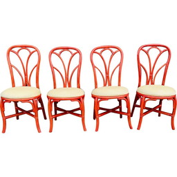 Set van 4 vintage rode rotan stoelenSet van 4 vintage rode rotan stoelen