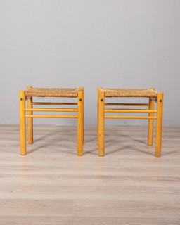 Paar Vintage 70s krukjes van hout en touw, Ibisco DesignPaar Vintage 70s krukjes van hout en touw, Ibisco Design