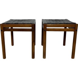 Paar vintage krukjes van hout en bruin leerPaar vintage krukjes van hout en bruin leer
