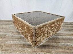 Vintage salontafel bekleed met stof met glazen bladVintage salontafel bekleed met stof met glazen blad