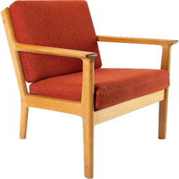 Vintage rode wollen en eiken fauteuil van Hans J. Wegner bij Getama 1960
