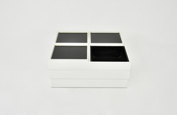 als nieuw, vierkante salontafel met omkeerbaar eiken blad in wit en zwart met stalen lopers