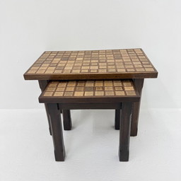 Set van 2 brutalistische bijzettafels van massief eikenhout met tegelblad, jaren 70