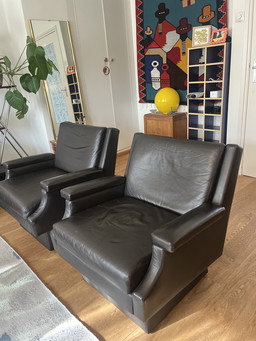 Mid-century moderne bruine leren loungestoelen (paar)Mid-century moderne bruine leren loungestoelen (paar)