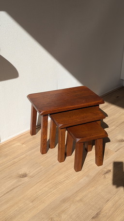 Set van 3 brutalistische eikenhouten bijzettafels in elkaar te schuiven, mid-century stijl.