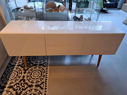 Set vintage nachtkastjes blond houten zwarte pootjes