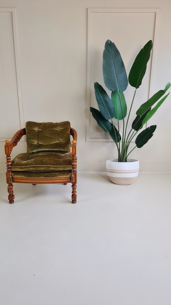 Deze prachtige vintage lage stoel van Giorgetti heeft een prachtig gemaakt houten frame in combinatie met een luxe groene fluwelen bekleding. De ingewikkelde details op het frame en de getufte fluwelen kussens stralen elegantie en verfijning uit. Deze lage stoel is perfect als accentstoel of als statement en geeft elk interieur een vleugje Italiaans vakmanschap en tijdloze stijl.