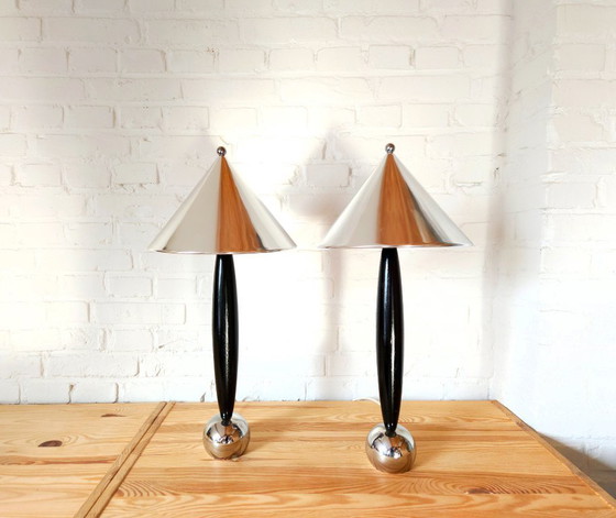 1 van 2 stilistische vintage tafellamp met aluminium kap, minimalistische lamp met geometrische vormen; nog 2 beschikbaar