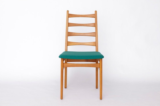 Vintage eetkamerstoel uit de jaren 60-70. Duitse oorsprong, fabrikant onbekend. De prijs is voor 1 stoel. Er zijn er in totaal 3 beschikbaar. Kenmerken: Frame: Stabiel beukenhout Bekleding: Nieuw gestoffeerde zittingen met groene stof die het hout prachtig complementeert. Staat: Over het algemeen goede vintage staat. Afmetingen: Breedte: 46 cm Hoogte: 88 cm Diepte: 53 cm Zithoogte: 45 cm Verzending: Wereldwijde verzekerde verzending Standaardlevering: 1-2 weken binnen Europa, 3-5 weken voor overzeese bestemmingen (Noord- en Zuid-Amerika, Azië) Expressverzending: Beschikbaar op aanvraag (toeslag van toepassing) 💎 Ontdek meer unieke vintage schatten in mijn winkel! 💬 Weet u niet zeker welke stoelen het beste bij uw ruimte passen? Stuur me een foto van uw interieur - ik beveel graag een zorgvuldig samengestelde set van 4 of 6 stoelen aan die bij uw stijl passen. 🪑✨