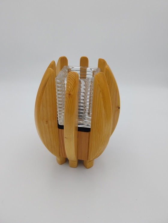 1 x Zweedse grenen kandelaar met glazen inzet. 1970's