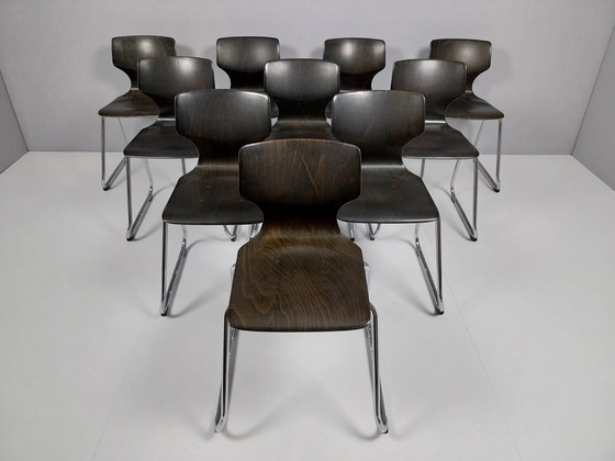 Set van 10 vintage designstoelen van Vanerum uit de jaren 60 – 70, uitgevoerd met een Pagholz (Pagwood) zitting en rugleuning. Deze stoelen combineren een ergonomisch gevormde houten schaal (gemaakt van geperst en gelamineerd hout) met een stevig verchroomd sledeframe. Dit type werd oorspronkelijk ontworpen voor scholen en kantines, maar is vandaag erg geliefd binnen het mid-century en Scandinavisch interieur.