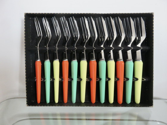 Set van 12 Rockabilly roestvrijstalen en veelkleurige plastic dessertvorkjes, Frankrijk, jaren 60. Gloednieuw in originele doos (doos licht beschadigd). Lengte 17cm, perfecte staat, zeer origineel en ongewoon model.