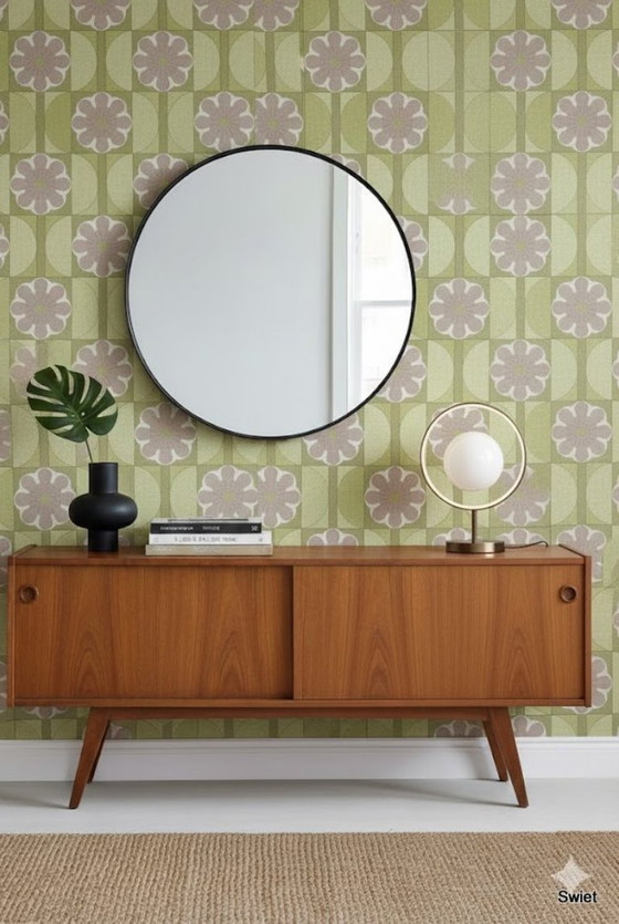 Dit is het soort behang dat meteen sfeer maakt. Zet er een oranje vaas naast en je hebt een tijdcapsule aan de muur.