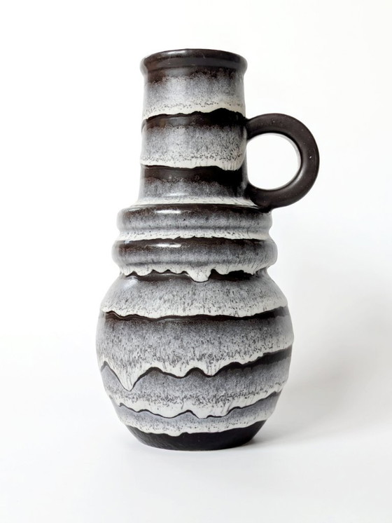 Een opvallende kruikvaas uit het midden van de vorige eeuw van Scheurich Keramik, West-Duitsland, in het model Vienna. De minimalistische vorm met het ronde handvat wordt benadrukt door een gedurfd glazuur: een matzwarte basis met horizontale witte druppelbanden die een subtiel grijsverloop creëren.