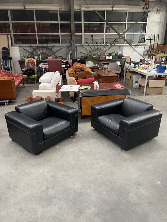 Paar lounge fauteuils van Osvaldo Borsani voor Tecno, model D120. De stoelen hebben een originele zwarte eco lederen bekleding, op stalen poten. Afmetingen: breedte 104 cm, diepte 85 cm, hoogte 64 cm, zithoogte 38 cm. Prijs voor de set.