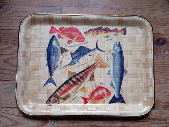 Ontdek dit vintage dienblad uit de jaren 1970, een uniek stuk van geweven vezel met plastic coating versierd met een levendig zeevisontwerp. Dit dienblad is zowel functioneel als esthetisch en geeft je interieur een retro tintje. We zijn dol op de gouden rand, die een vleugje kitsch toevoegt!