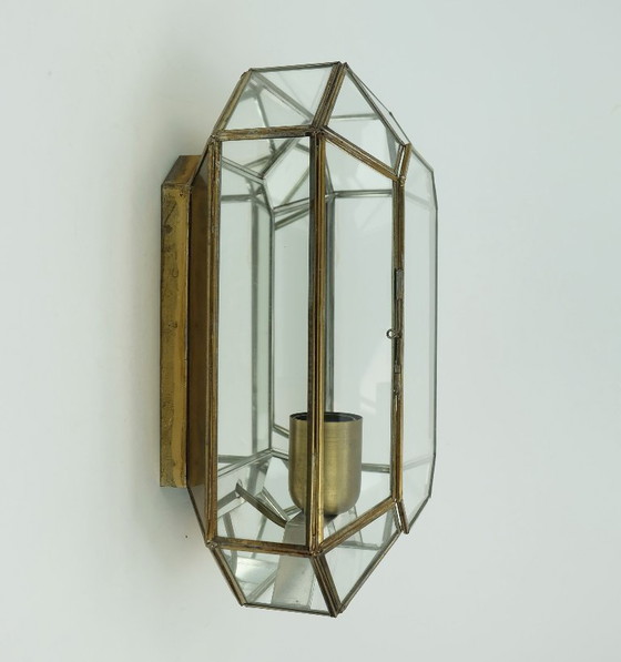 Een zeer bijzondere wandlamp uit de jaren 70 of 80. Gefabriceerd door Manfred Fenske Leuchten, Duitsland. Het materiaal is messingkleurig gelakt metaal, helder glas en spiegelglas. Het spiegelglas aan de achterkant zorgt voor een zeer interessant lichteffect. Geschikt voor één E27-lamp. Lampen zijn niet inbegrepen. Direct aan te sluiten op de muur.
