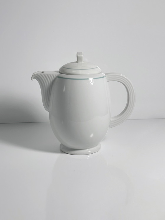 Bijzonder mooie kan in Art Deco Revival stijl uit de jaren 1980. Wit porselein voldoet aan een elegante designtaal met mintgroene accenten. Geschikt voor zowel koffie en thee als koude dranken. Ligt prettig in de hand en schenkt prachtig. Het geraffineerde ontwerp maakt de kan ook een lust voor het oog als decoratief object.