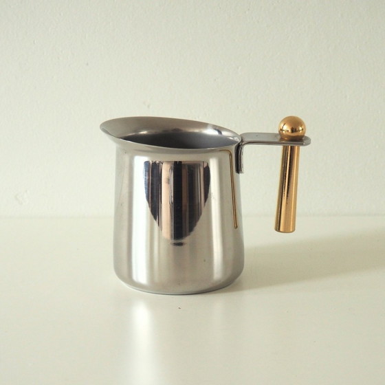 Melkkannetje uit 1980 van premium inox 18/10 roestvrij staal met vergulde handgrepen. De melkkan maakt deel uit van de 'Kitty Oro' serie van koffiezetter Guido Bergna, Italië. Het dienblad uit dezelfde serie is ook verkrijgbaar. Conditie: slijtage in overeenstemming met leeftijd en gebruik Herkomst: Italië Fabrikant: Guido Bergna Afmetingen: ca. hoogte 8 cm x diameter excl. handvat 7 cm x diameter incl. handvat 10 cm Tijdperk: jaren '80 Materialen: inox 18/10 roestvrij staal, goud