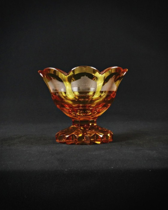 Dit is een zeldzame bokaal van Duits luxe vakmanschap uit de tweede helft van de 19e eeuw! Deze souvenirbekers van gegraveerd amberkleurig kristal waren erg populair in de jaren 1850-1880, toen de elite de "Grand Tour" langs de Rijn maakte.