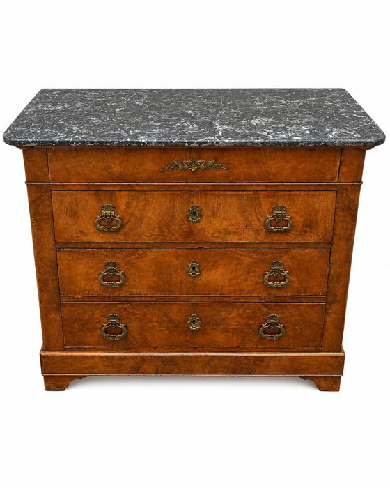 19e-eeuwse ladekast van Louis Philippe, vervaardigd uit wortelnotenhout met een marmeren blad.