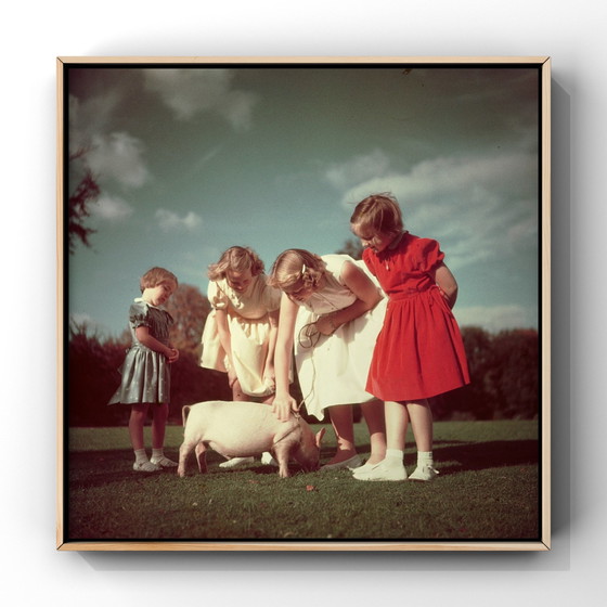 Iconische Foto van Paul Huf (1952) – De Drie Prinsessen met een Biggetje Unieke fine art print van een legendarische foto gemaakt door Paul Huf in 1952. Deze historische afbeelding toont de drie prinsessen van het Koninklijk Huis – Beatrix, Irene en Margriet – samen met een biggetje. Een speels en ontroerend moment, vastgelegd in de kenmerkende stijl van Paul Huf. Fotograaf: Paul Huf Jaar: 1952 Afbeelding: Prinses Beatrix, Prinses Irene en Prinses Margriet met een biggetje Formaat: 30,5 cm x 30,5 cm, inclusief witrand Stijl: Fine art fotografie van museumkwaliteit Conditie: Nieuw en perfect geschikt om in te lijsten