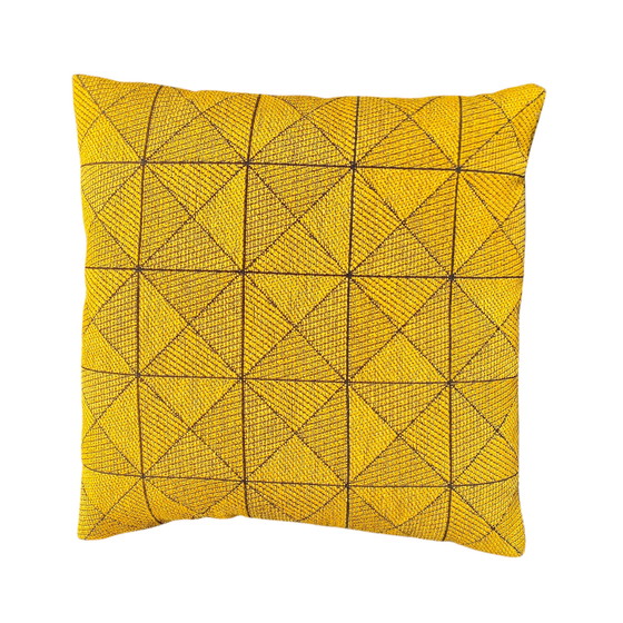 "De wollen stof waarmee het Tegelkussen is bekleed, is speciaal ontworpen door zeer bekwame ambachtslieden in een Noorse fabriek (Gudbrandsdalens Uldvarefabrik) die al sinds 1884 bestaat. Dit verklaart de kwaliteit van deze kussens met hun betoverende geometrische patronen, perfect om de uitstraling van een bank, fauteuil of bed te verfraaien."