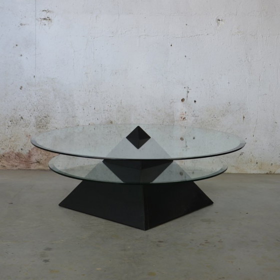 Deze unieke piramidevormige salontafel uit de jaren 90 combineert opvallend hout en glas. Het geometrische ontwerp geeft elke woonruimte een moderne uitstraling en is daarmee de perfecte blikvanger.